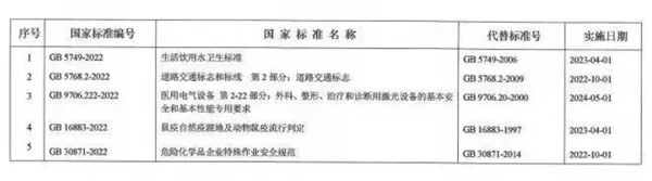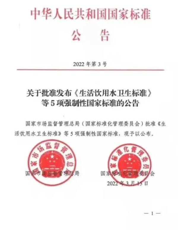 2022年3月15日,国家市场监督管理总局和国家标准化管理委员会联合发布中华人民共和国国家标准公告(2022年第3号)“关于批准发布《生活饮用水卫生标准等5项强制性国家标准的公告》”,正式批准《生活饮用水卫生标准》等5项强制性国家标准。